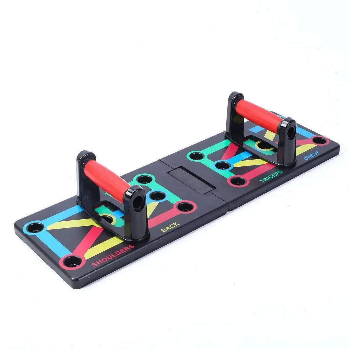 - Different color-coded push-up board targets specifics muscles worked (blue: chest, red: shoulders, yellow: back, green: triceps).